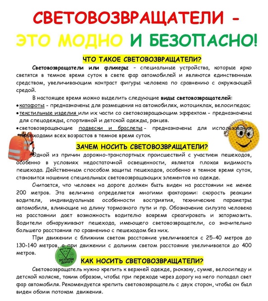 Уважаемые родители!В связи с коротким световым днём для безопасности ваших детей на дорогах просьба обеспечить их светоотражающими элементами. Присутствие светоотражающих элементов на детской одежде может значительно снизить детский травматизм на дорогах. Такой элемент позволит лучше заметить ребенка, если на улице темно, что актуально для зимнего времени года и просто в пасмурную или дождливую погоду. Очень хорошо, если светоотражающие элементы уже присутствуют на одежде, но, если их нет, такие элементы можно приобрести и пришить самостоятельно. Их цветовая гамма и дизайн очень разнообразен, что не испортит внешний вид одежды. Большой популярностью стали пользоваться фликеры - специальные детали для детей и подростков. Фликеры представляют собой наклейки или значки, они легко крепятся к детской одежде. Веселые картинки наверняка понравятся вашему ребенку. Как вариант можно приобрести светоотражающую тесьму. Такая тесьма пришивается в необходимых местах и также не портит общий вид одежды, а даже дополняет её. Приобретите детям светоотражатели. Фликер не боится ни влаги, ни мороза – носить его можно в любую погоду. Фликер – это, в первую очередь, безопасность на дороге для Вас и Вашего ребёнка. Обозначьте себя и дайте увидеть вас водителю, берегите себя! Но полагаться только лишь на фликеры тоже не стоит. Это всего лишь один из способов пассивной защиты пешеходов. Необходимо помнить о воспитании грамотного пешехода с детства. Чтобы ребенок не нарушал Правила дорожного движения, он должен не просто их знать - у него должен сформироваться навык безопасного поведения на дороге. Наглядный пример родителей – лучший урок для ребенка! Уважаемые родители! Научите ребенка привычке соблюдать Правила дорожного движения. Побеспокойтесь о том, чтобы Ваш ребенок «засветился» на дороге. Примите меры к тому, чтобы на одежде у ребенка были светоотражающие элементы, делающие его очень заметным на дороге.Помните - в темной одежде маленького пешехода просто не видно водителю, а значит, есть опасность наезда. БЕЗОПАСНОСТЬ ДЕТЕЙ – ОБЯЗАННОСТЬ ВЗРОСЛЫХ! СВЕТООТРАЖАТЕЛИ СОХРАНЯТ ЖИЗНЬ! |