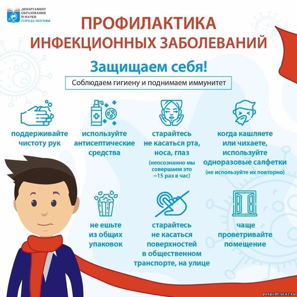 Инфекционного больного необходимо изолировать на дому или в инфекционной больнице. Необходимо ограничить контакт с больным других членов семьи, пользоваться средствами защиты при уходе за больным (маски, перчатки, дезинфицирующие средства). После обслуживания больного нужно тщательно мыть руки с использованием антисептиков. Больной с температурой, жалобами на головную боль, кашель, боли в животе, рвоту, понос, зуд, сыпь на теле не должен идти на работу, в школу и места скопления людей. Необходимо обратиться за медицинской помощью к врачу и выполнять все его рекомендации. Для поддержания иммунитета против инфекций рекомендуется соблюдать здоровый образ жизни, полноценно питаться, соблюдать режим труда и отдыха, избегать стрессовых ситуаций, активно заниматься физкультурой и спортом. |