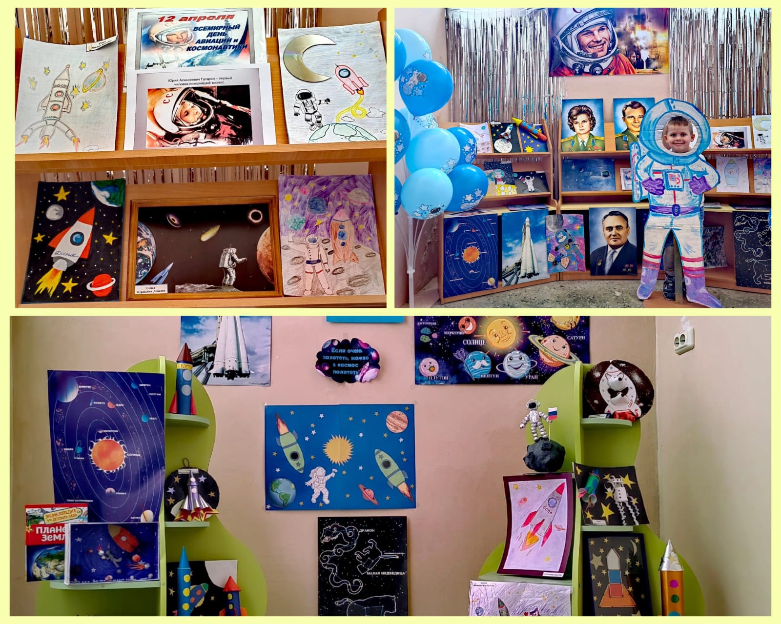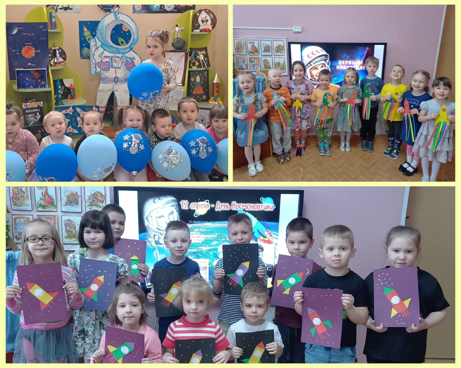 | 12 апреля наша страна отмечает День Космонавтики. Мы помним эту дату и гордимся! В детском саду прошла тематическая неделя, посвящённая космосу. Библиотекарь Чижикова Анна Юрьевна рассказала историю освоения космоса, о первом полете человека в космос. Воспитанники узнали много новых профессий, связанных с космонавтикой , рисовали, делали поделки на тему "Космос". Организована выставка совместных семейных работ. Дети получили знания о космосе и заряд положительных эмоций. |