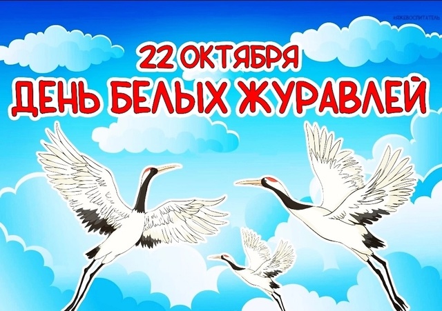 | День белых журавлей отмечается в России 22 октября. Этот праздник был придуман поэтом Расулом Гамзатовым в память обо всех воинах, которые погибли в Великую Отечественную войну и в других войнах и конфликтах. В этот день чтят память погибших в войнах солдат и прославляют дружбу народов. Традиционно участники акции запускают в небо сделанных своими руками белых журавликов в знак уважения к погибшим. В 2009 году 22 октября был добавлен в список международных праздников ЮНЕСКО и стал отмечаться как День солидарности и поэтической песни о погибших солдатах во всём мире. |